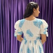 This charming summer frock features a delicate white base adorned with abstract peony motifs in soft shades of blue. Designed with a flattering box neckline and playful puff sleeves, it adds volume and femininity to your warm-weather wardrobe. The tieable bows at the shoulders allow for an adjustable fit, enhancing both comfort and style, making it perfect for sunny outings. With a length of 50 inches and available in sizes XS to XXXL, this dress is ready to ship in just 7-10 working days.